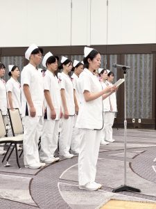 そして、ナイチンゲール像から灯されたろうそくの火を受け取り、 全員でナイチンゲール誓詞を唱和。 凛とした表情と力強い声に、看護師への決意が感じられました。